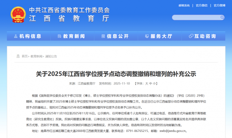 近日,江西省教育厅发布《关于2025年江西省学位授予点动态调整撤销和增列的公示》《关于2025年江西省学位授予点动态调整撤销和增列的补充公示》(点击查看)。 公示显示,我省2025年学位授予点动态调整申请增列“密码”专业学位硕士点1个(华东交通大学“密码”专业学位硕士点)。 拓展: “增列