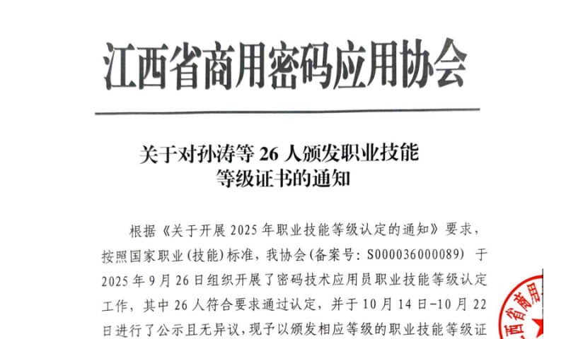 江西省商用密码应用协会(以下简称“协会”)于2017年8月1日在江西南昌成立,是由江西省内从事密码学研究、密码产品生产、销售及其他相关业务的单位和组织自愿组成的非营利性专业性的社会团体。